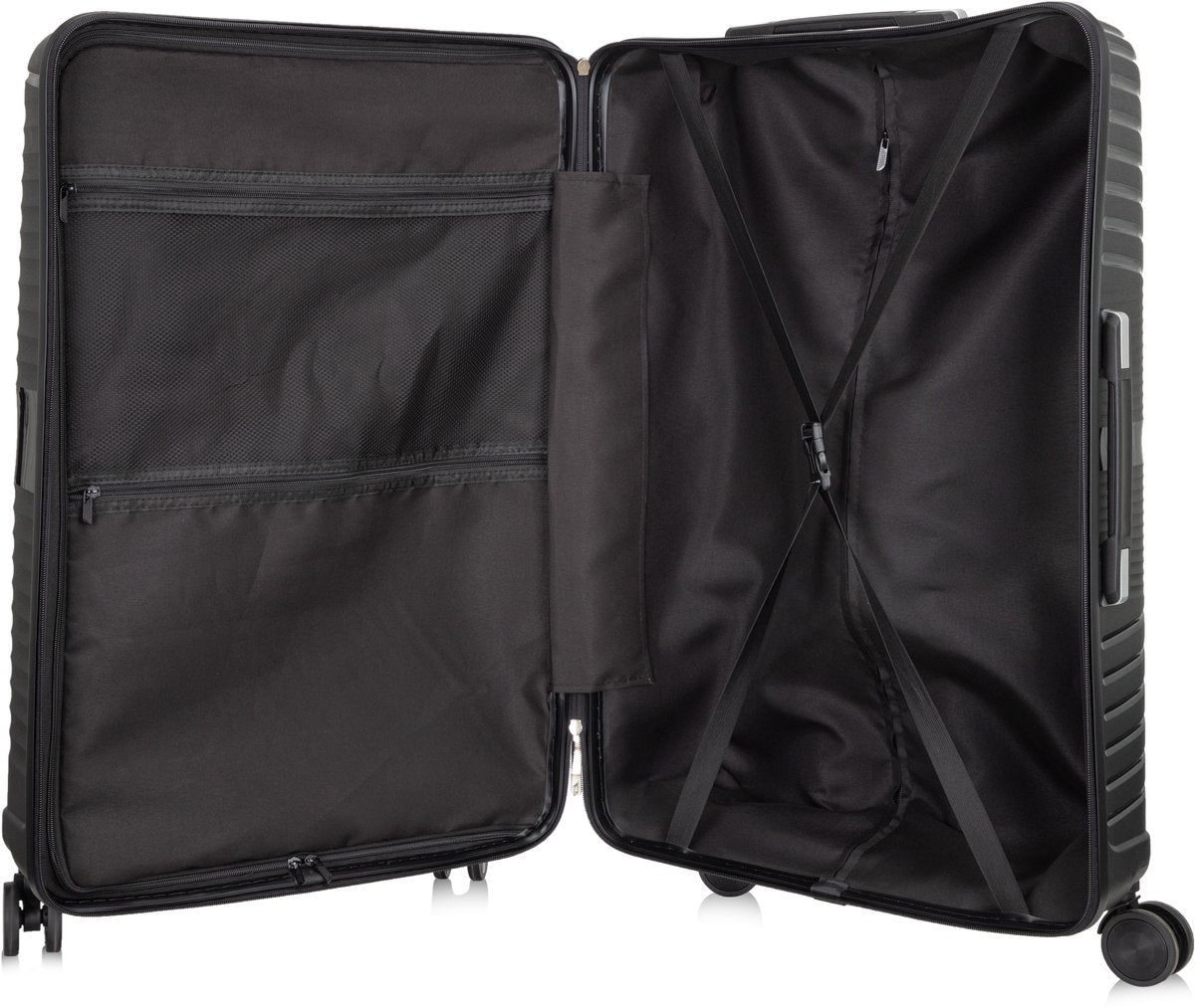 • Felszereltség: TSA számzár, 360°-ban forgatható kerekek, rugalmas rögzítőhevederek, belső zsebek, kihúzható teleszkópos fogantyú