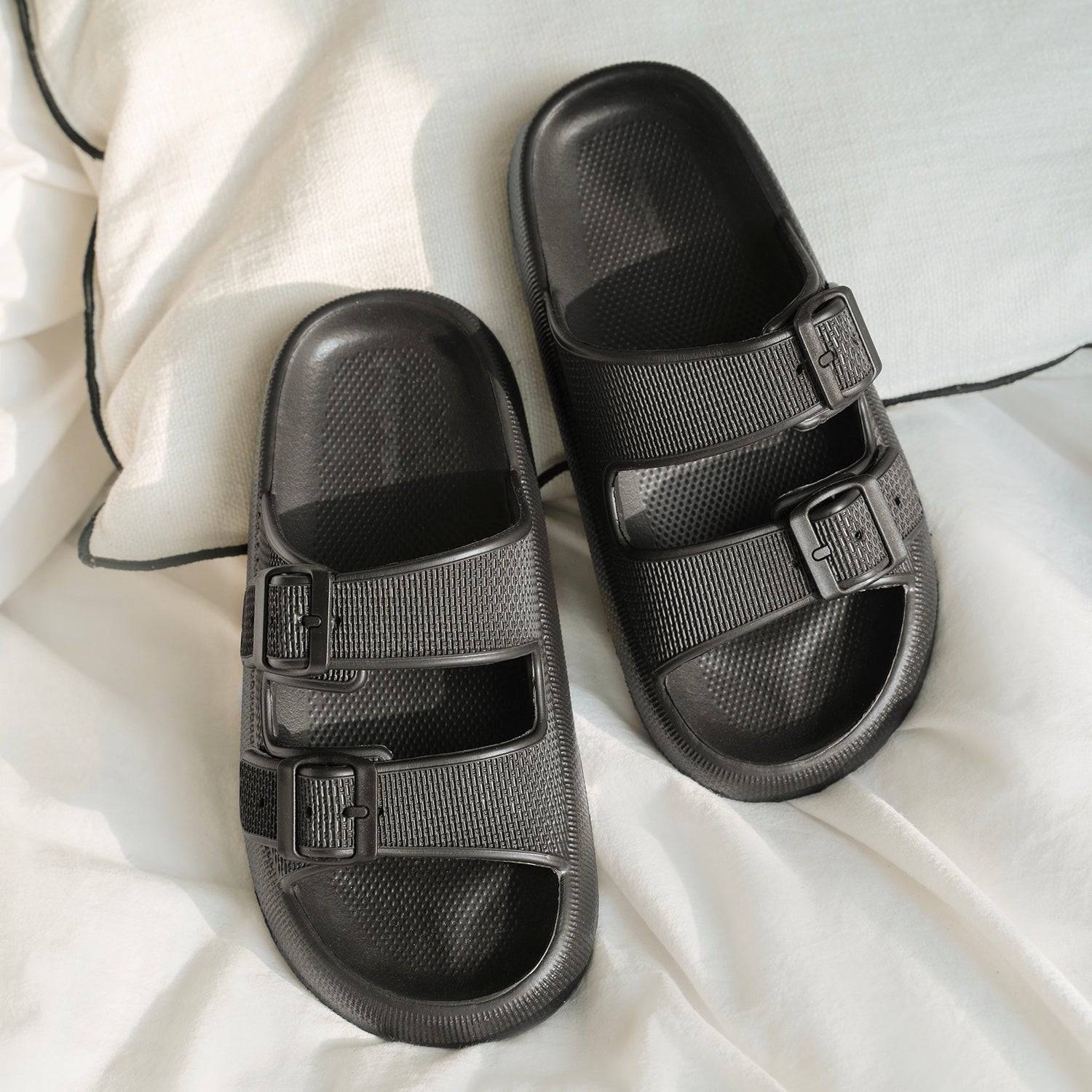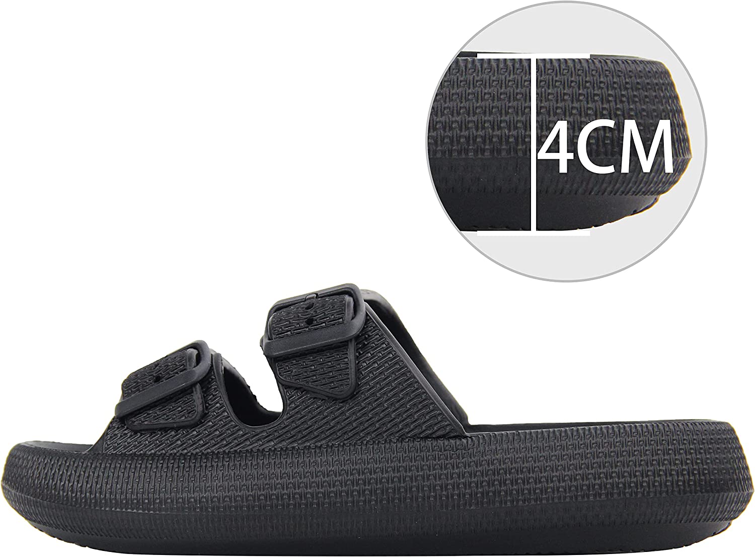 - Dizájn: Nyitott slide, széles lábfej pánt, extra vastag talp