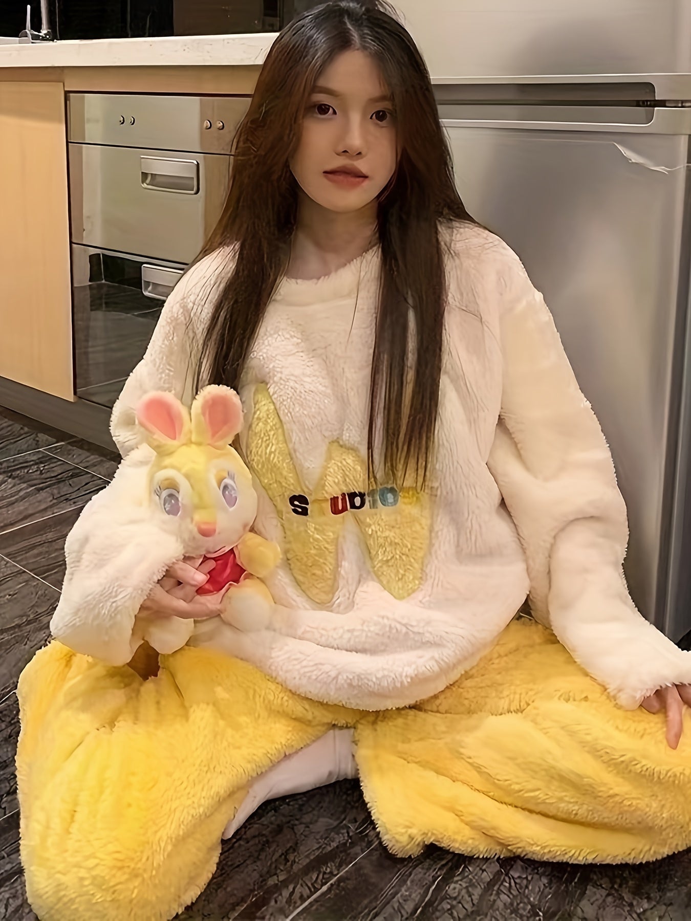 Miért válaszd ezt – Női fleece pizsama szett hímzéssel és kerek nyakkivágással az ősz/télre – Alissa