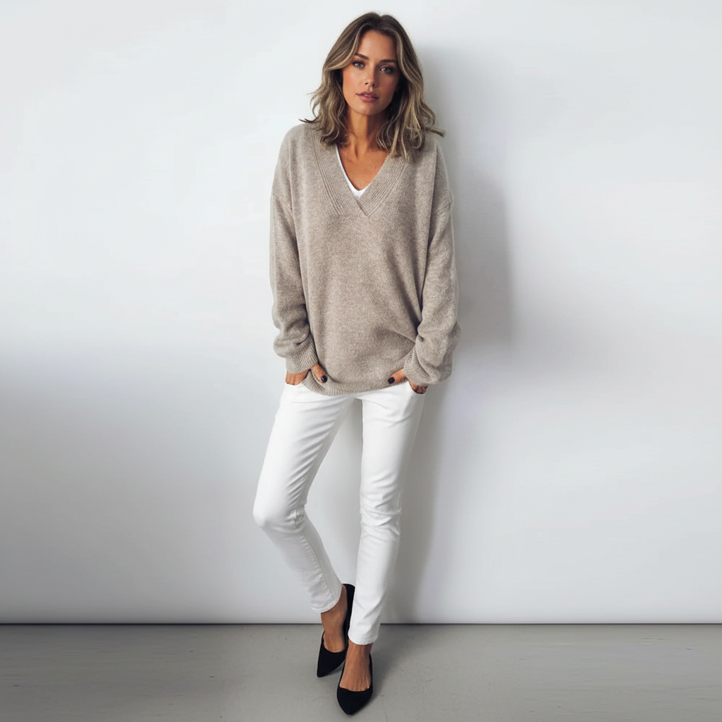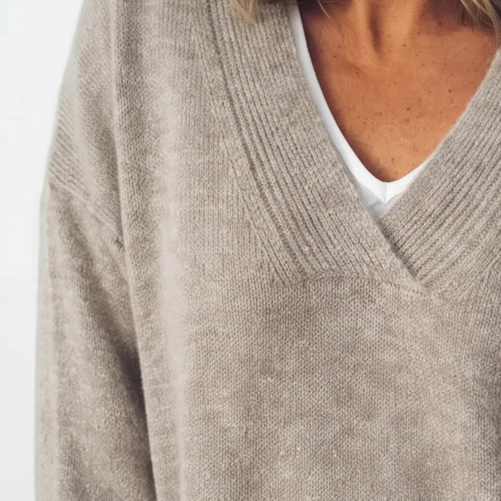 Nincs is kellemetlenebb, mint a viszkető pulóverek, amelyek egész nap zavarják a testet. Ez a kötés megoldja a problémát különösen puha kasmírral, amely finoman körülöleli a bőrt. Az elegáns V-nyak lehetővé teszi a modern, ápolt megjelenést anélkül, hogy túlságosan feltűnő lenne. A laza illeszkedés könnyedén alkalmazkodik a hétköznapjaihoz, az irodától a szabadidőig.
