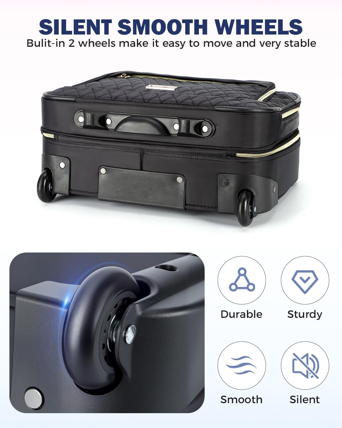 Ez a gurulós laptop táska nagy 3 rekeszes kialakítással rendelkezik, 16 zsebbel, hogy mindent elférjen, amire szükséged van munkához vagy rövid utazásokhoz. Biztonságosan tárolja a legfeljebb 15,6 hüvelyk (39,62 cm) méretű laptopokat, miközben külön szekciókat biztosít a dokumentumok, töltők és személyes tárgyak számára. Vízálló 272T poliészter többrétegű anyagból készült, amely megvédi a holmiját az enyhe esőtől és a napi kopásoktól. Két sima gumikerék, egy elrejthető alumínium teleszkópos fogantyú és egy párnázott felső fogantyú kényelmessé és sokoldalúvá teszi a szállítást.