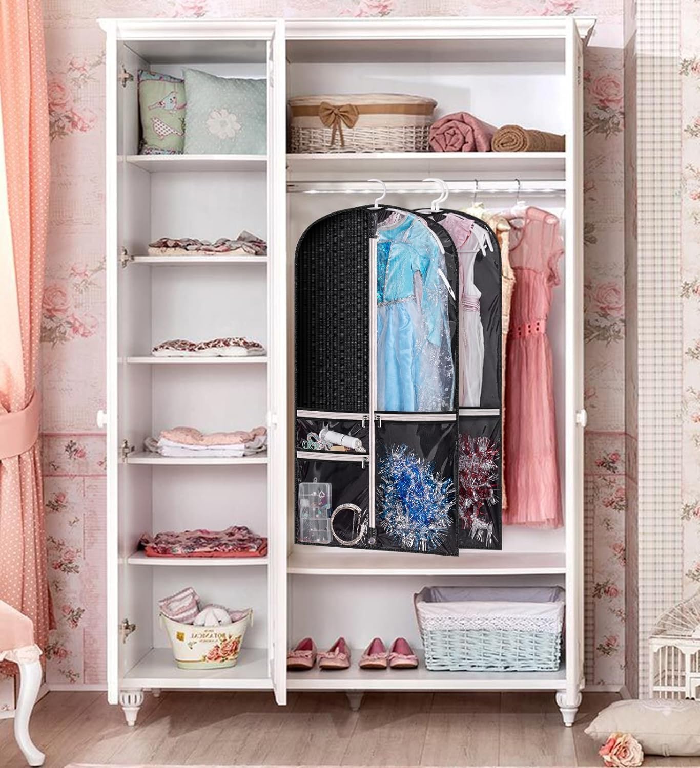 Könnyű, lélegző PEVA-ból készült, átlátszó PVC elülső ablakkal, minden ruhazsák 1-3 öltözetet tárol. A három beépített cipzáras zseb lehetővé teszi, hogy egyszerre csomagolja be a cipőket, sminket, hajkiegészítőket vagy kis esszenciákat. Az alsó grommet hurok segítségével könnyen hordozhatóak versenyekre, órákra vagy turnéra. Kompakt és hajtható, tökéletes gyerekek és felnőttek számára, akik egyszerű, porálló tárolást igényelnek.
